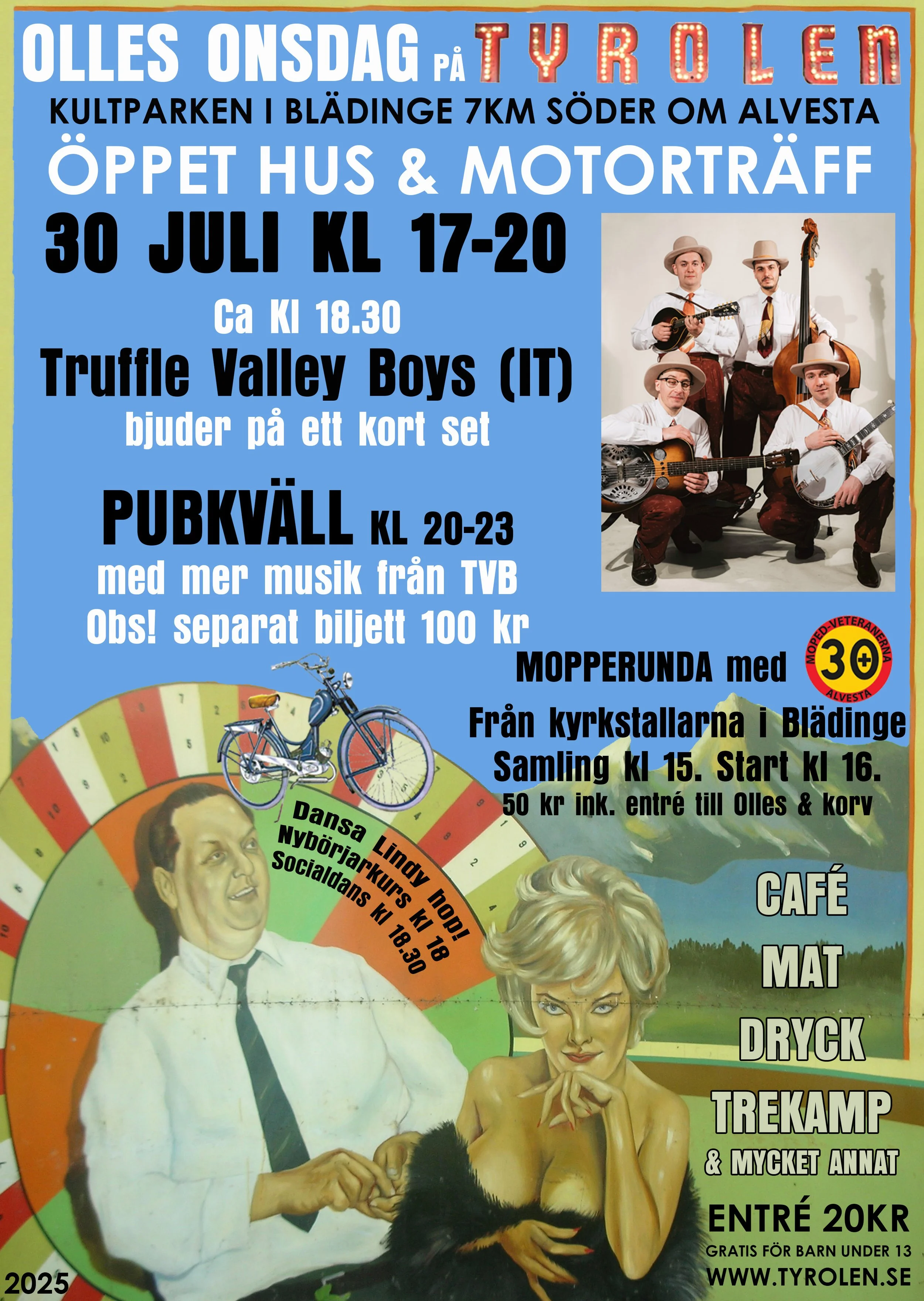 Det blir denna gång även en MOPPERUNDA! Japp, ’Mopedveteranerna 30+ Alvesta’ och andra hugade moppeförare är välkomna att samlas kl. 15 vid kyrkstallarna i Blädinge, för att köra en härlig mopperunda tillsammans, med målgång på Tyrolen ca 17.30. Vid kyrkstallarna betalar man 50 kr, kontant eller via swish och får info om rundan. Start kl 16. Målgång på Tyrolen ca 17.30 i ordnat led & uppställning av mopederna på anvisad plats. Entré till Olles & varmkorv eller fika ingår i biljettpriset.